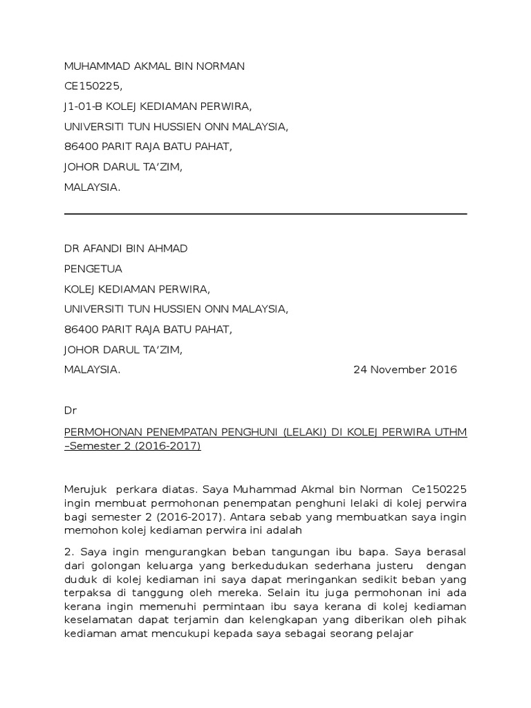 Related : Surat Rayuan Kolej Kediaman - Pengetua kolej kediaman perwira, universiti tun hussien onn malaysia, 86400 parit raja batu pahat, johor darul tazim, malaysia..
