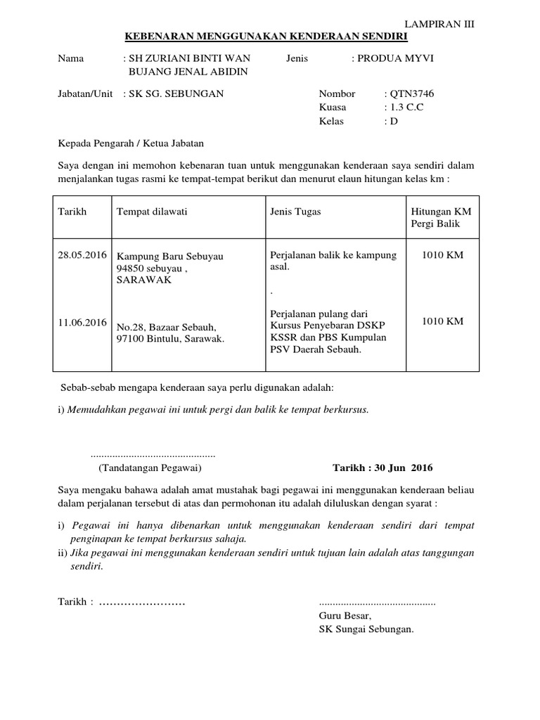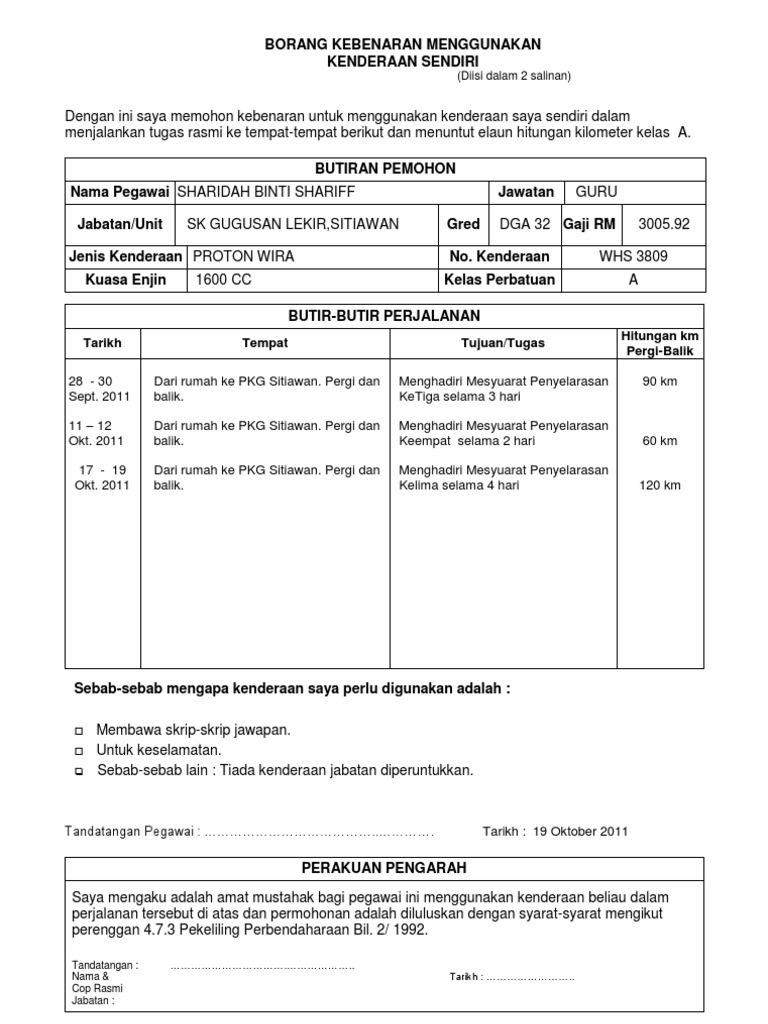 Borang Menggunakan Kenderaan Sendiri Surat Rasmi Permohonan Menggunakan Kenderaan Nirumahmal Kenderaan Yang Disewa Hendaklah Dipandu Sendiri Oleh Penyewa Atau Pqosamh from tse3.mm.bing.net Saya juga akan menggunakan bayaran tunai dan bersetuju menerima 1. Menggunakan kenderaan saya sendiri dalam menjalankan tugas rasmi ke tempat berikut dan menuntut elaun perjalanan kenderaan. Dokumen yang diperlukan untuk buat insuran ni adalah pastikan kenderaan yang nak di pandu adalah kenderaan berdaftar atas nama kita sendiri. Kebenaran ini diberikan untuk membawa murid bagi urusan rasmi kementerian pendidikan malaysia. Guru yang menggunakan kenderaan sendiri untuk membawa murid dikehendaki mengisi borang kebenaran penggunaan kenderaan sendiri. Format borang tempahan tiket terkini. Kenderaan yang disewa hendaklah dipandu sendiri oleh penyewa atau. Borang kebenaran menggunakan kenderaan sendiri.